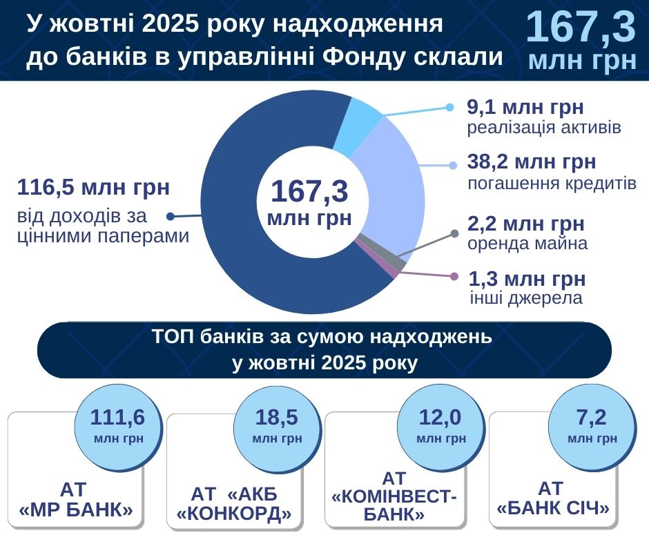 Протягом жовтня 2025 року сума надходження коштів до банків, що ліквідуються Фондом гарантування вкладів фізичних осіб (далі – Фонд), склала понад 167,3 млн грн.
