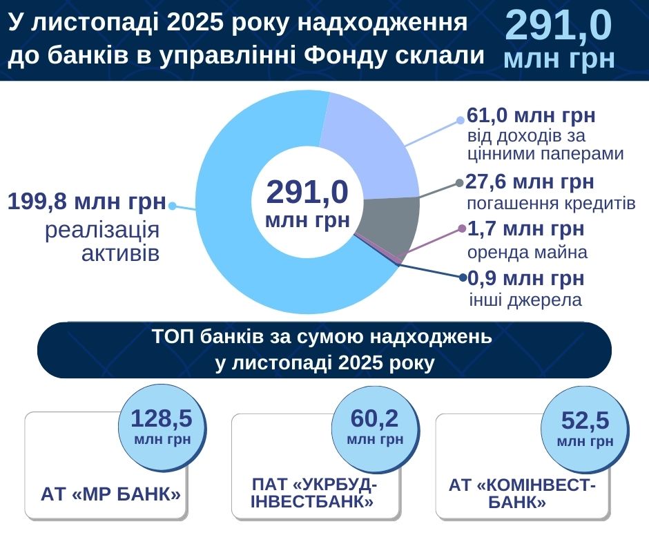 У листопаді 2025 року сума надходження коштів до банків, що ліквідуються Фондом гарантування вкладів фізичних осіб (далі – Фонд), склала близько 291,0 млн грн.