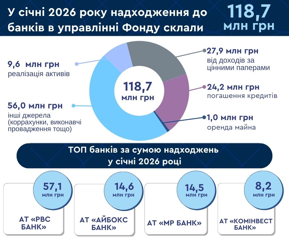 У січні 2026 року сума надходження коштів до банків, що ліквідуються Фондом гарантування вкладів фізичних осіб (далі – Фонд), склала близько 118,7 млн грн.